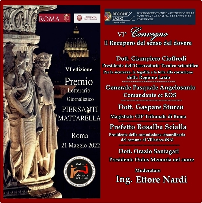 Il 21 maggio 2022, alle ore 16:30, avrà luogo il convegno Il recupero del senso del dovere, dove relatori esperti di legalità, impegno civile e lotta alle mafie discuteranno di diritto applicato, moralità ed esperienze personali. A seguire la premiazione dei titoli finalisti del Premio Piersanti Mattarella 2022. Appuntamento a Roma, nella sala della Protomoteca, in Campidoglio.
